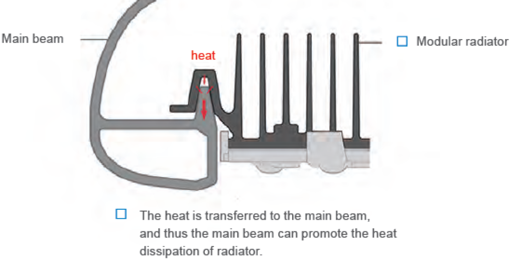 It is available to make clever use of the module bracket that only plays a supporting role, and to transform it to a “heat-conductive bracket” that is capable of conducting the module’s heat to the lamp shell as a structural part, thus to promote the cooling effect of radiator of cooling module. The design aims to fully utilize the surface area of structural parts to transfer heat to air.